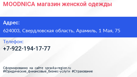 MOODNICA, магазин женской одежды по адресу 624003, Свердловская область, Арамиль, 1 Мая, 75 в дальнейшем Организация, размещена в следующих категориях: