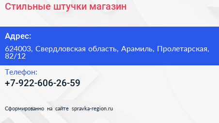 Стильные штучки, магазин по адресу 624003, Свердловская область, Арамиль, Пролетарская, 82/12 в дальнейшем Организация, размещена в следующих категориях: