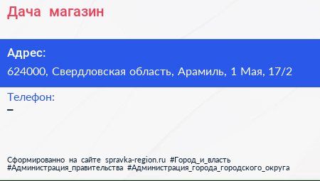Дача+, магазин по адресу 624000, Свердловская область, Арамиль, 1 Мая, 17/2 в дальнейшем Организация, размещена в следующих категориях: