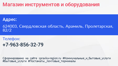 Магазин инструментов и оборудования по адресу 624003, Свердловская область, Арамиль, Пролетарская, 82/2 в дальнейшем Организация, размещена в следующих категориях: