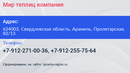 Мир теплиц, компания по адресу 624003, Свердловская область, Арамиль, Пролетарская, 82/13 в дальнейшем Организация, размещена в следующих категориях: