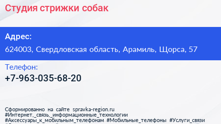 Студия стрижки собак по адресу 624003, Свердловская область, Арамиль, Щорса, 57 в дальнейшем Организация, размещена в следующих категориях: