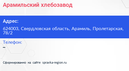 Арамильский хлебозавод по адресу 624003, Свердловская область, Арамиль, Пролетарская, 78/2 в дальнейшем Организация, размещена в следующих категориях: