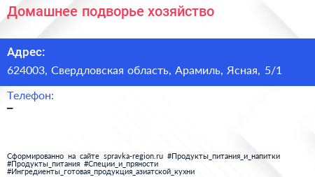 Домашнее подворье, хозяйство по адресу 624003, Свердловская область, Арамиль, Ясная, 5/1 в дальнейшем Организация, размещена в следующих категориях: