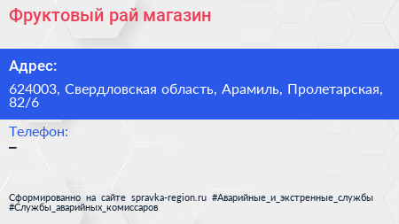 Фруктовый рай, магазин по адресу 624003, Свердловская область, Арамиль, Пролетарская, 82/6 в дальнейшем Организация, размещена в следующих категориях: