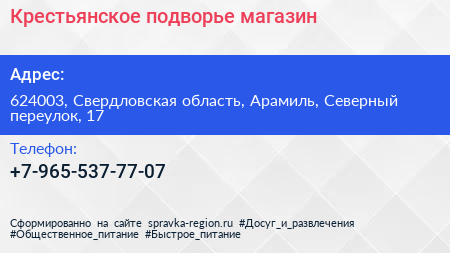 Крестьянское подворье, магазин по адресу 624003, Свердловская область, Арамиль, Северный переулок, 17 в дальнейшем Организация, размещена в следующих категориях: