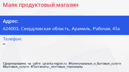 Маяк, продуктовый магазин по адресу 624003, Свердловская область, Арамиль, Рабочая, 45а в дальнейшем Организация, размещена в следующих категориях: