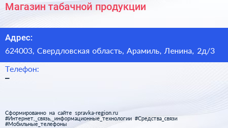 Магазин табачной продукции по адресу 624003, Свердловская область, Арамиль, Ленина, 2д/3 в дальнейшем Организация, размещена в следующих категориях: