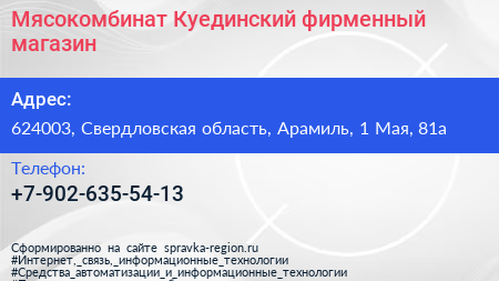 Мясокомбинат Куединский, фирменный магазин по адресу 624003, Свердловская область, Арамиль, 1 Мая, 81а в дальнейшем Организация, размещена в следующих категориях:
