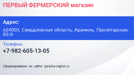ПЕРВЫЙ ФЕРМЕРСКИЙ, магазин по адресу 624003, Свердловская область, Арамиль, Пролетарская, 82/6 в дальнейшем Организация, размещена в следующих категориях: