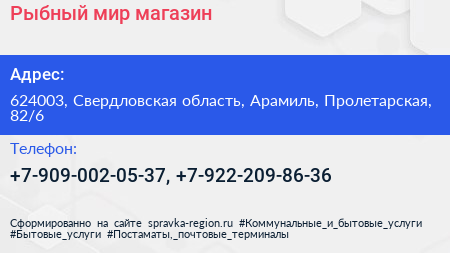 Рыбный мир, магазин по адресу 624003, Свердловская область, Арамиль, Пролетарская, 82/6 в дальнейшем Организация, размещена в следующих категориях: