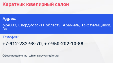 Каратник, ювелирный салон по адресу 624003, Свердловская область, Арамиль, Текстильщиков, 3а в дальнейшем Организация, размещена в следующих категориях: