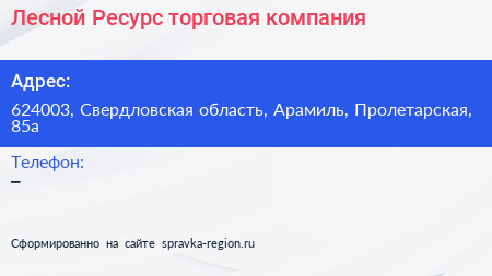 Лесной Ресурс, торговая компания по адресу 624003, Свердловская область, Арамиль, Пролетарская, 85а в дальнейшем Организация, размещена в следующих категориях: