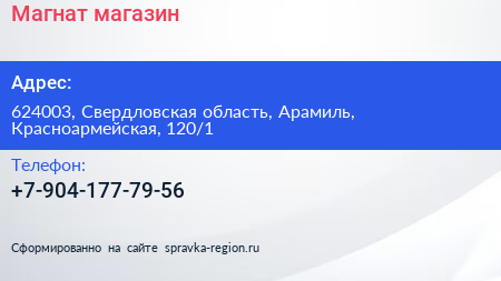 Магнат, магазин по адресу 624003, Свердловская область, Арамиль, Красноармейская, 120/1 в дальнейшем Организация, размещена в следующих категориях: