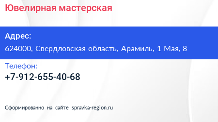 Ювелирная мастерская по адресу 624000, Свердловская область, Арамиль, 1 Мая, 8 в дальнейшем Организация, размещена в следующих категориях: