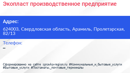 Экопласт, производственное предприятие по адресу 624003, Свердловская область, Арамиль, Пролетарская, 82/13 в дальнейшем Организация, размещена в следующих категориях: