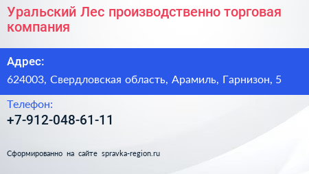 Уральский Лес, производственно-торговая компания по адресу 624003, Свердловская область, Арамиль, Гарнизон, 5 в дальнейшем Организация, размещена в следующих категориях: