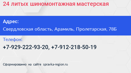 24 литых, шиномонтажная мастерская по адресу Свердловская область, Арамиль, Пролетарская, 78Б в дальнейшем Организация, размещена в следующих категориях: