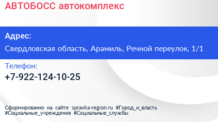 АВТОБОСС, автокомплекс по адресу Свердловская область, Арамиль, Речной переулок, 1/1 в дальнейшем Организация, размещена в следующих категориях: