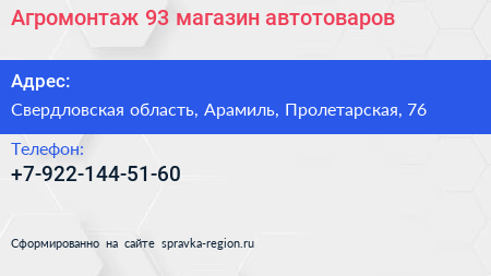 Агромонтаж-93, магазин автотоваров по адресу Свердловская область, Арамиль, Пролетарская, 76 в дальнейшем Организация, размещена в следующих категориях: