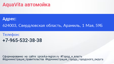 AquaVita, автомойка по адресу 624003, Свердловская область, Арамиль, 1 Мая, 59Б в дальнейшем Организация, размещена в следующих категориях:
