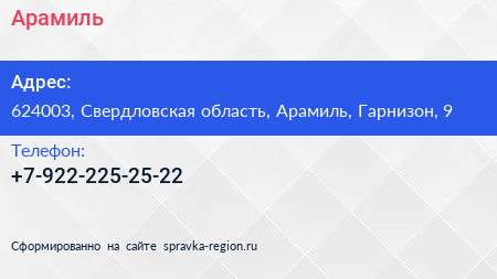Арамиль по адресу 624003, Свердловская область, Арамиль, Гарнизон, 9 в дальнейшем Организация, размещена в следующих категориях: