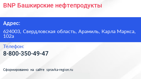 BNP Башкирские нефтепродукты по адресу 624003, Свердловская область, Арамиль, Карла Маркса, 102а в дальнейшем Организация, размещена в следующих категориях: