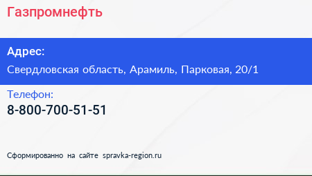 Газпромнефть по адресу Свердловская область, Арамиль, Парковая, 20/1 в дальнейшем Организация, размещена в следующих категориях: