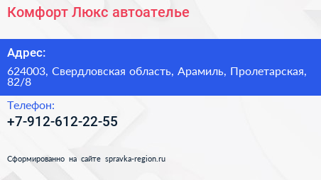 Комфорт Люкс, автоателье по адресу 624003, Свердловская область, Арамиль, Пролетарская, 82/8 в дальнейшем Организация, размещена в следующих категориях: