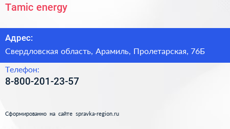 Tamic energy по адресу Свердловская область, Арамиль, Пролетарская, 76Б в дальнейшем Организация, размещена в следующих категориях: