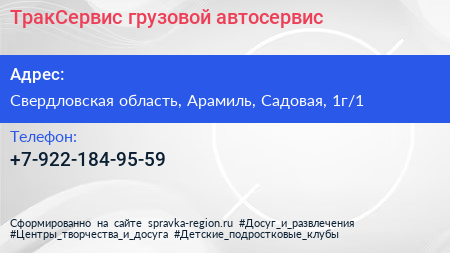 ТракСервис, грузовой автосервис по адресу Свердловская область, Арамиль, Садовая, 1г/1 в дальнейшем Организация, размещена в следующих категориях: