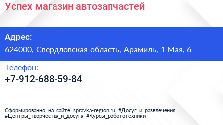 Успех, магазин автозапчастей по адресу 624000, Свердловская область, Арамиль, 1 Мая, 6 в дальнейшем Организация, размещена в следующих категориях:
