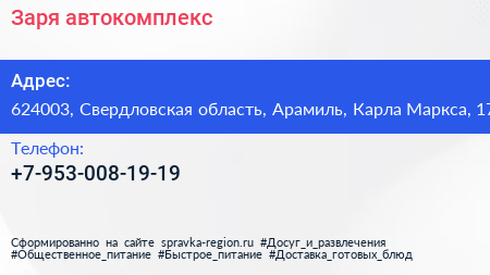 Заря, автокомплекс по адресу 624003, Свердловская область, Арамиль, Карла Маркса, 17 в дальнейшем Организация, размещена в следующих категориях: