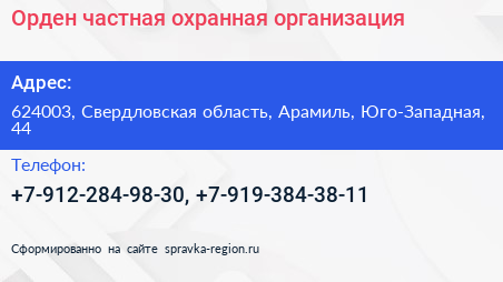 Орден, частная охранная организация по адресу 624003, Свердловская область, Арамиль, Юго-Западная, 44 в дальнейшем Организация, размещена в следующих категориях: