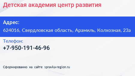 Детская академия, центр развития по адресу 624016, Свердловская область, Арамиль, Колхозная, 23а в дальнейшем Организация, размещена в следующих категориях: