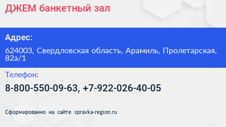 ДЖЕМ, банкетный зал по адресу 624003, Свердловская область, Арамиль, Пролетарская, 82а/1 в дальнейшем Организация, размещена в следующих категориях: