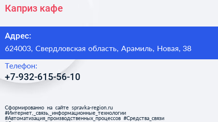 Каприз, кафе по адресу 624003, Свердловская область, Арамиль, Новая, 38 в дальнейшем Организация, размещена в следующих категориях: