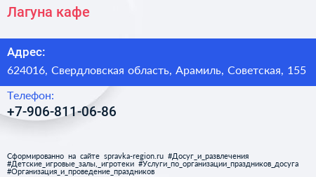 Лагуна, кафе по адресу 624016, Свердловская область, Арамиль, Советская, 155 в дальнейшем Организация, размещена в следующих категориях: