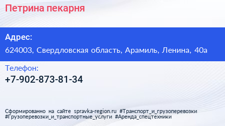 Петрина, пекарня по адресу 624003, Свердловская область, Арамиль, Ленина, 40а в дальнейшем Организация, размещена в следующих категориях: