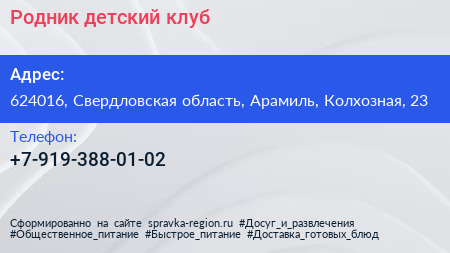 Родник, детский клуб по адресу 624016, Свердловская область, Арамиль, Колхозная, 23 в дальнейшем Организация, размещена в следующих категориях: