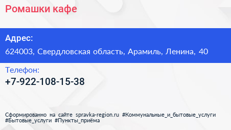 Ромашки, кафе по адресу 624003, Свердловская область, Арамиль, Ленина, 40 в дальнейшем Организация, размещена в следующих категориях: