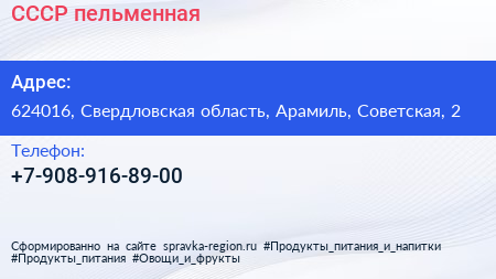 СССР, пельменная по адресу 624016, Свердловская область, Арамиль, Советская, 2 в дальнейшем Организация, размещена в следующих категориях:
