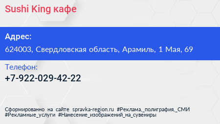 Sushi King, кафе по адресу 624003, Свердловская область, Арамиль, 1 Мая, 69 в дальнейшем Организация, размещена в следующих категориях: