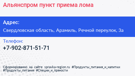 Альянспром, пункт приема лома по адресу Свердловская область, Арамиль, Речной переулок, 3а в дальнейшем Организация, размещена в следующих категориях: