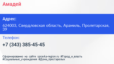 Амадей по адресу 624003, Свердловская область, Арамиль, Пролетарская, 39 в дальнейшем Организация, размещена в следующих категориях: