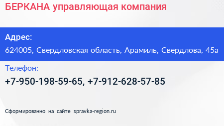 БЕРКАНА, управляющая компания по адресу 624005, Свердловская область, Арамиль, Свердлова, 45а в дальнейшем Организация, размещена в следующих категориях: