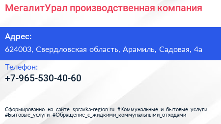 МегалитУрал, производственная компания по адресу 624003, Свердловская область, Арамиль, Садовая, 4а в дальнейшем Организация, размещена в следующих категориях: