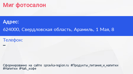 Миг, фотосалон по адресу 624000, Свердловская область, Арамиль, 1 Мая, 8 в дальнейшем Организация, размещена в следующих категориях: