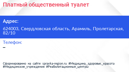 Платный общественный туалет по адресу 624003, Свердловская область, Арамиль, Пролетарская, 82/10 в дальнейшем Организация, размещена в следующих категориях: