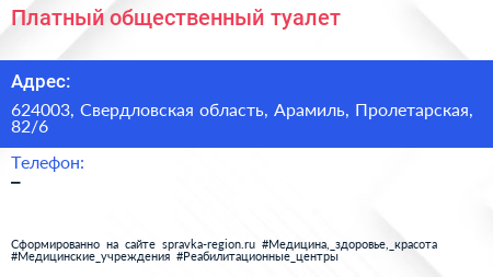 Платный общественный туалет по адресу 624003, Свердловская область, Арамиль, Пролетарская, 82/6 в дальнейшем Организация, размещена в следующих категориях: